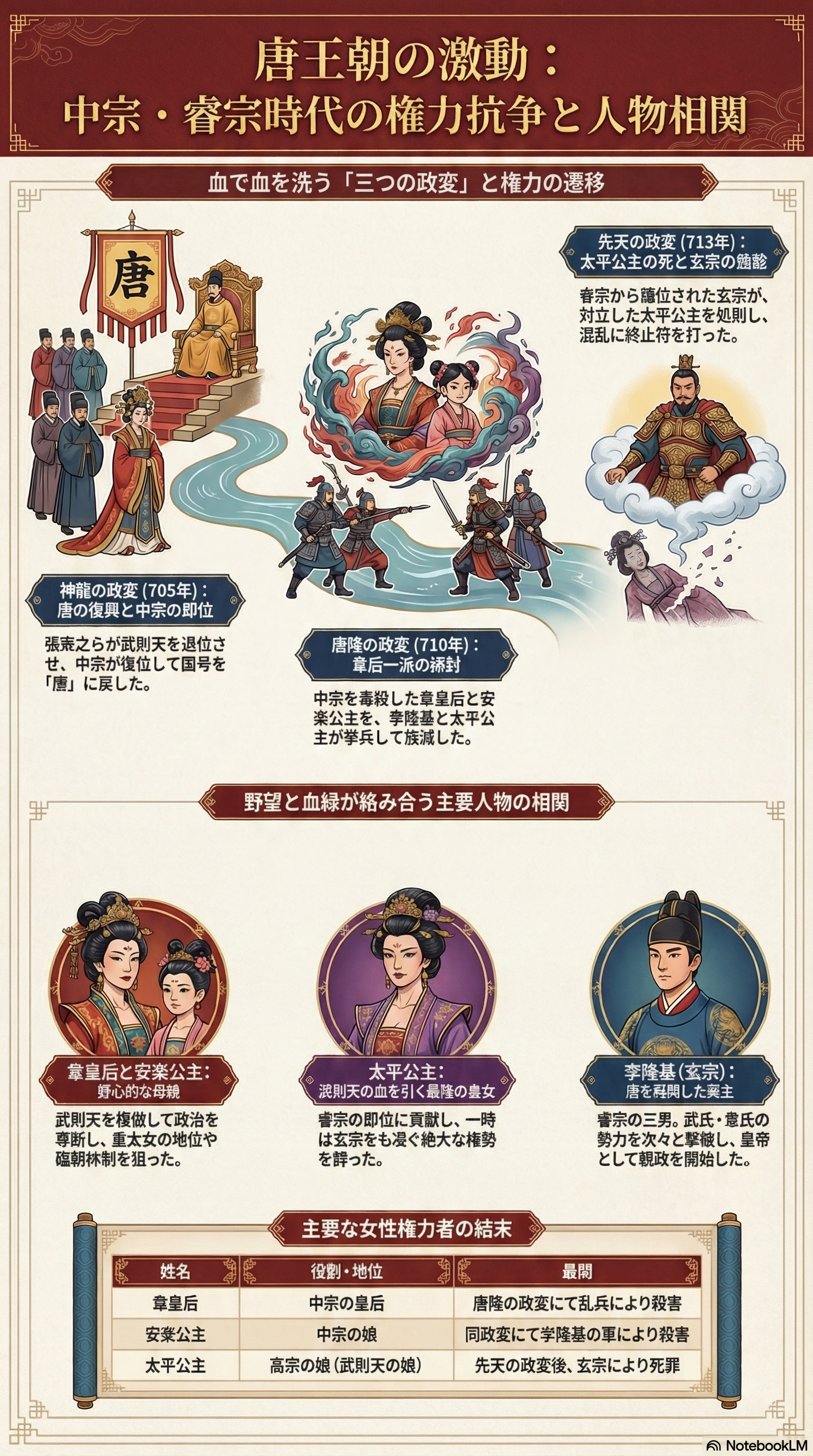 - 臨淄王(玄宗)が挙兵!:韋氏一党と武氏残党を一夜で壊滅させ、父・睿宗を帝位に就け、やがて自らが「開元の治」を切り拓く!
