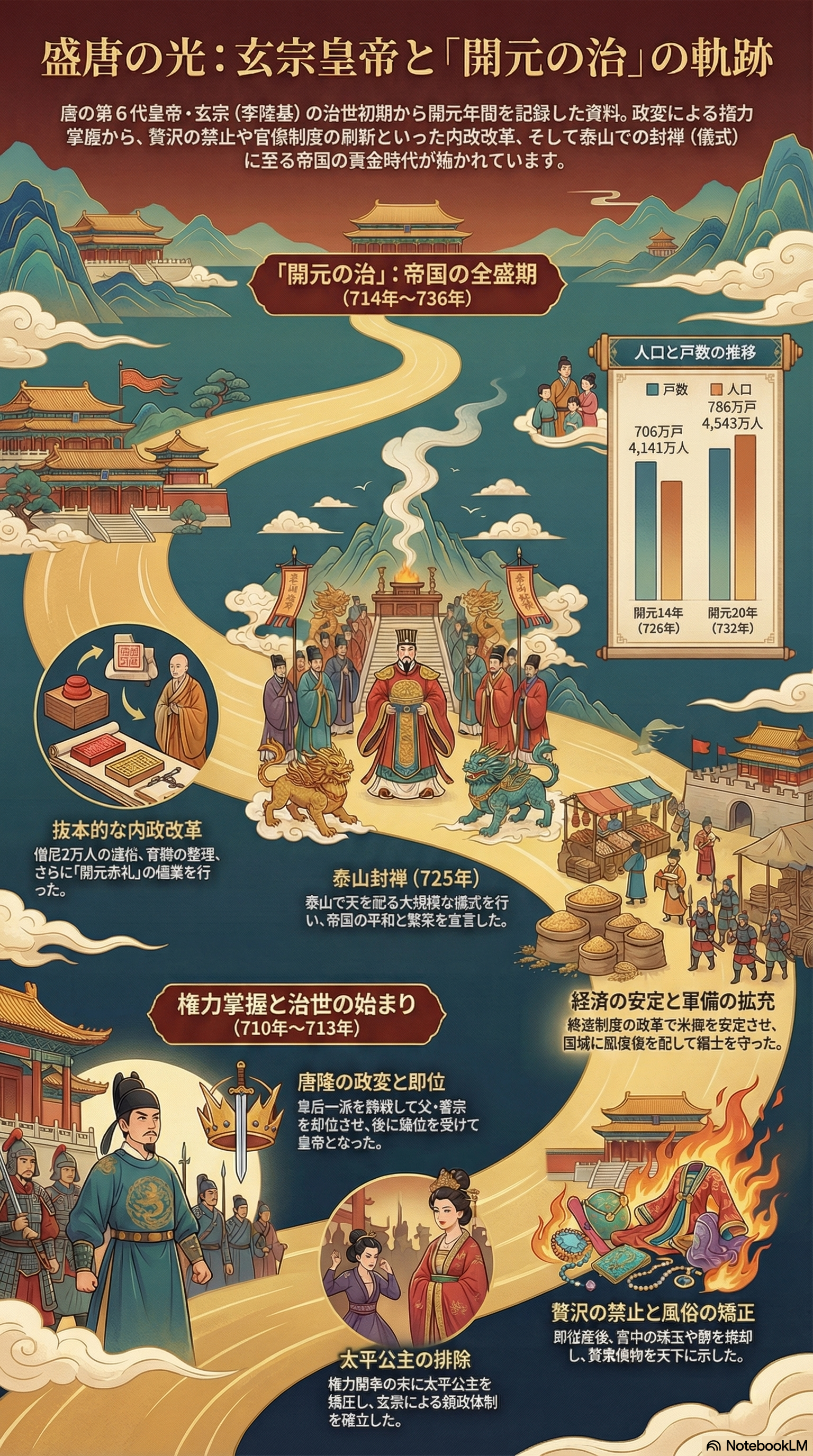 先天二年(713年)七月三日、太平公主が竇懐貞・蕭至忠・岑羲らと翌日に反乱を起こそうとしていた。玄宗は一日繰り上げて先制攻撃。わずか三百余人と家来の兵で北闘に突入し、常元楷・李慈を斬り、蕭至忠・岑羲を朝廷で捕らえて処刑した。太上皇・睿宗は翌日「軍国刑政の一切を皇帝に委ねる」と宣言し、玄宗の独裁が確立。そして十二月、「開元」に改元。武則天時代の象徴だった「天枢(銅鉄の記念碑)」も破壊され、その金属は軍事費に充てられた。「旧体制のシンボルを物理的に破壊する」という行為が、新時代の宣言となったのだ。